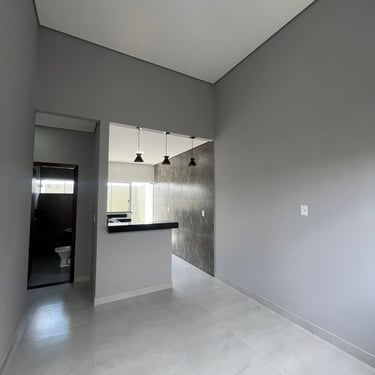 Com 3 dormitórios, sendo 1 suíte, possui 1 banheiro social, 2 vagas de garagem lado a lado, sala conjugada com cozinha com pé direito de 4 metros, quintal nos fundos da casa.